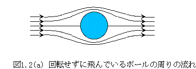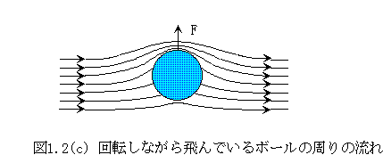 この図1.2(a)と図1.2(b)の流れを重ね合わせたものが図1.2(c)になります。回転しながら飛んでいるボールは、この力Fによって、曲がることになります。このような力の効果は、飛行機の翼の揚力と基本的に同じものです。